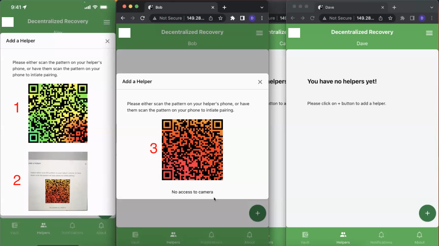 In terms of requirements to successfully support a specific DeRec Protocol-based workflow, a DeRec Owner must be able to pair with a minimum of three DeRec Helpers through a network like the internet. This is necessary to ensure that, when the DeRec Owner looks for at least half of the Helpers in order to recover a secret, that it never finds just one Helper. While three is the minimum number of Helpers, the DeRec Alliance’s recommendation to end-users is to pair their DeRec Owners with at least five Helpers. DeRec Owner app developers are strongly encouraged to trigger warnings for their end-users when (1) any DeRec Helper to which their Owner was paired cannot be contacted and (2) the number of reachable DeRec Helpers falls below four.